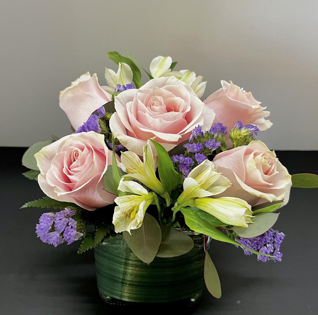 5 pink roses arranged sweet and low in a cube vase with purple and white filler flowers, and mixed greenery.